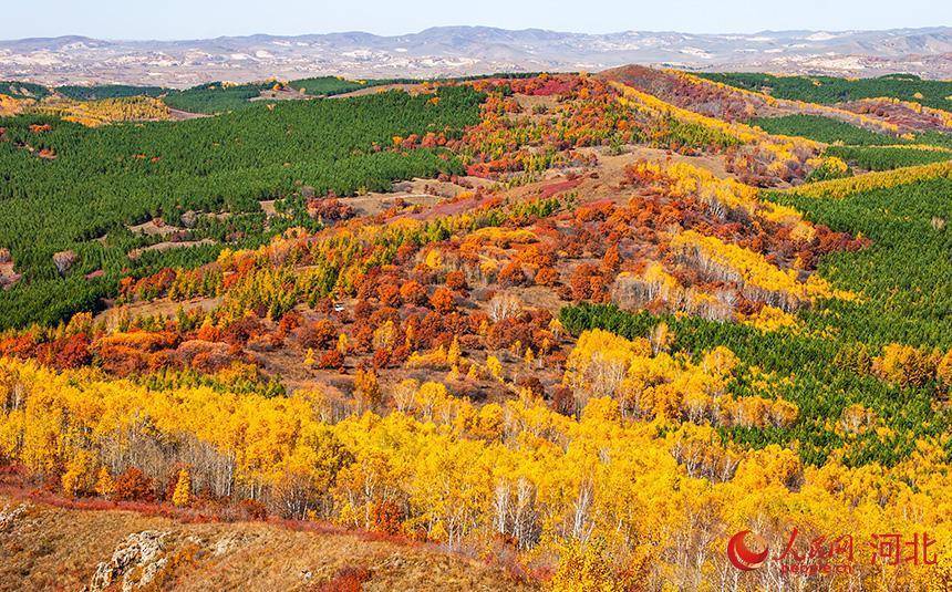 人民网承德9月29日电 (记者李兆民)金秋时节的河北围场迎来一年中最富诗意的季节。漫山层林尽染,白桦林披上金黄外衣,微风拂过时,叶片如“金箔”般簌簌飘落,在林间铺就松软绒毯,阳光穿过树林洒下斑驳跃动的光影;远望丘陵间,柞树与枫树似火焰般灼灼燃烧,与墨绿的油松林交织成层次分明的自然画卷。